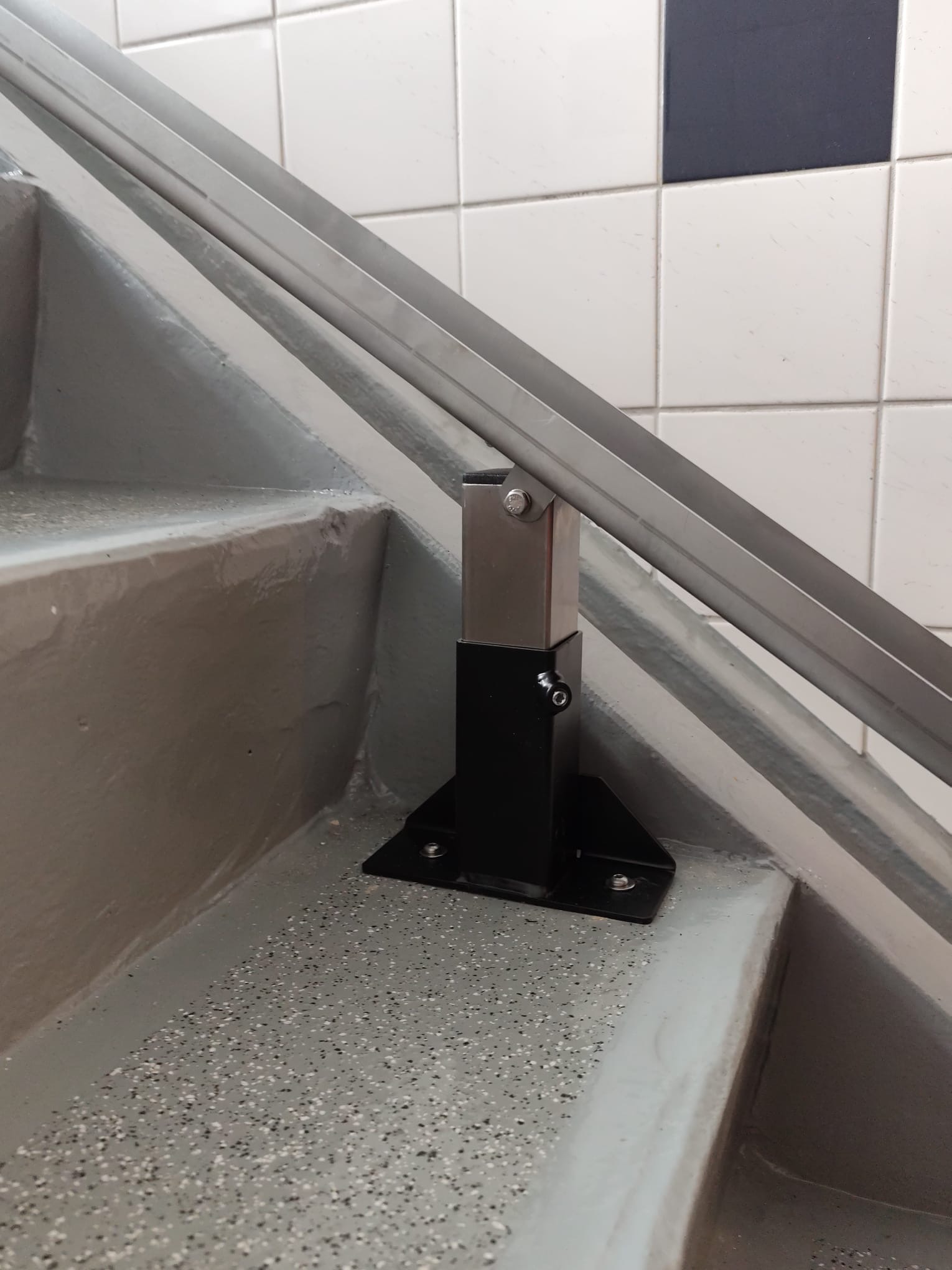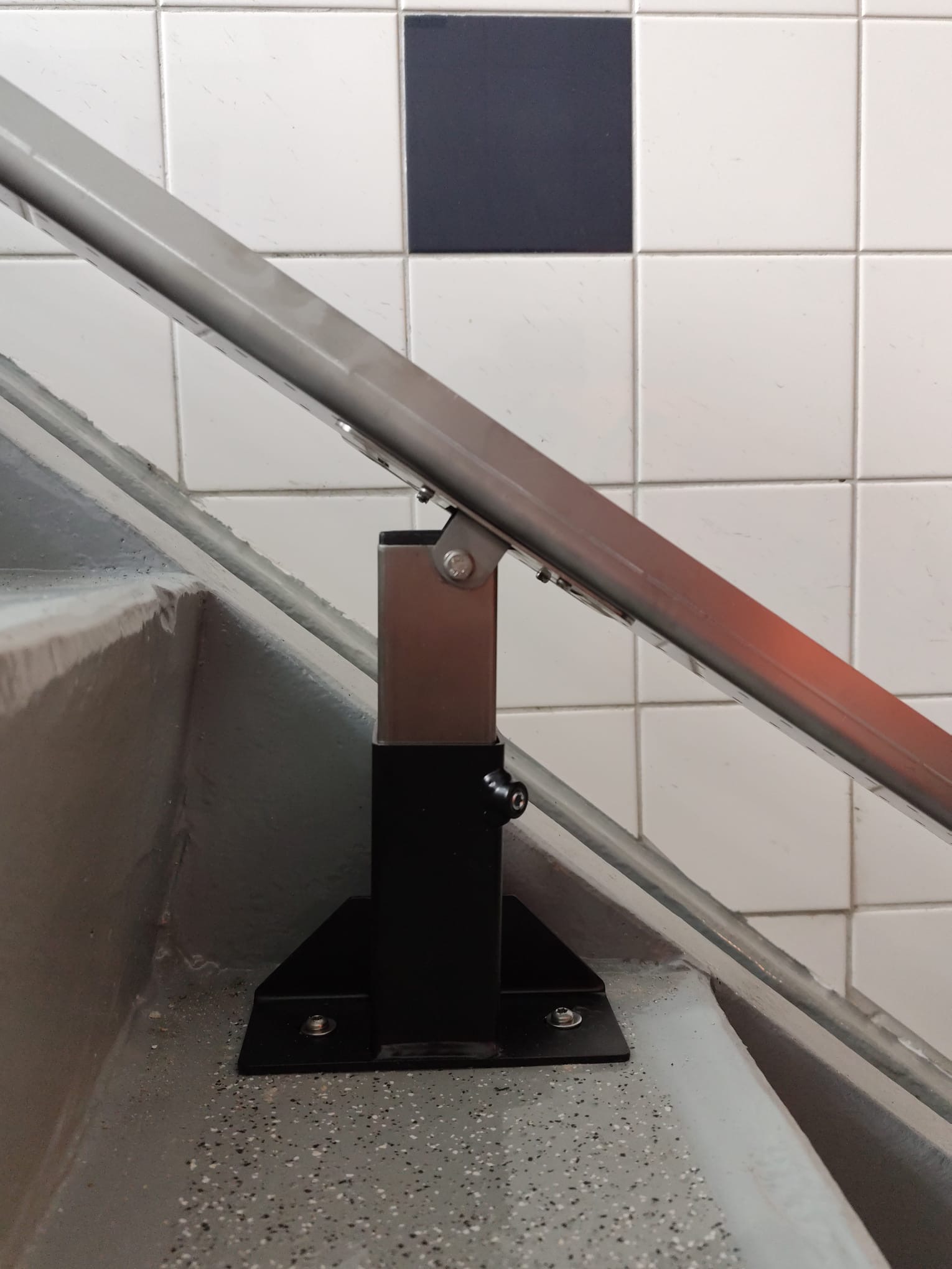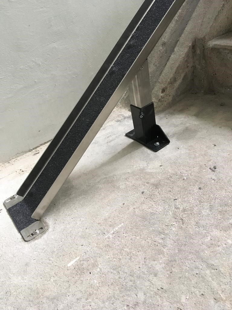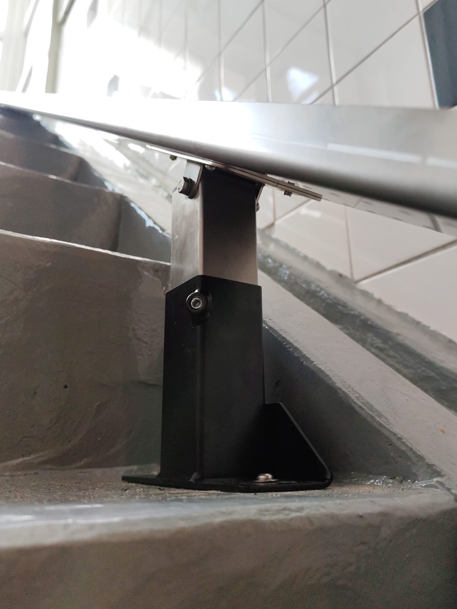 Lo Minck Mobility hat spezielle, höhenverstellbare Halterungen entwickelt, die einfach installiert werden können, um den Neigungswinkel der Edelstahl-Fahrradschiene zu optimieren. Diese Halterungen sind für den Innen- und Außeneinsatz geeignet und bieten die Flexibilität, die Neigung an die Gegebenheiten der Treppe anzupassen.
