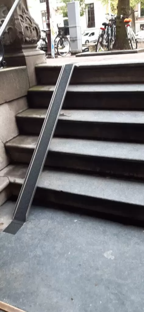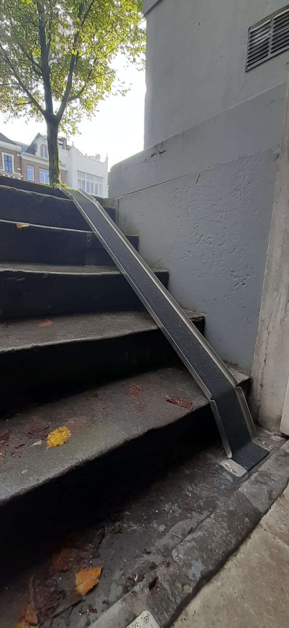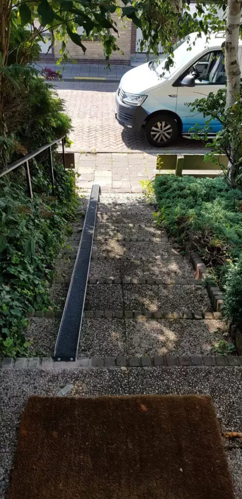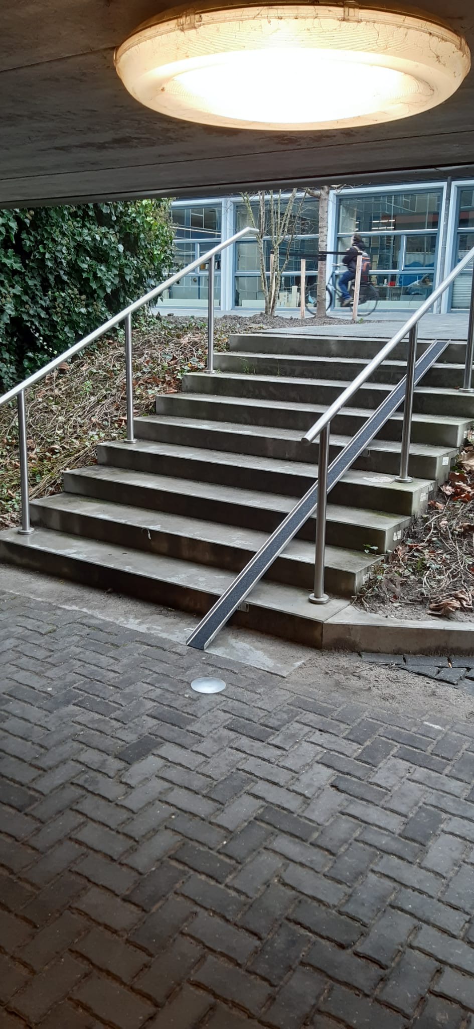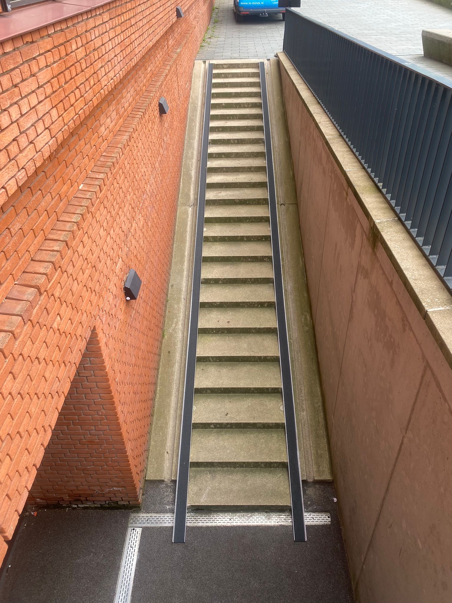 Die Edelstahl-Fahrradschiene von Lo Minck Mobility ist ein robustes und langlebiges System für den Fahrradtransport sowohl nach oben als auch nach unten. Sie besteht aus hochwertigem rostfreiem Stahl (RVS304) und bietet eine zuverlässige Lösung für das Führen von Fahrrädern, E-Scootern und Motorrädern über Treppen. Das U-Profil der Rinne dient als Spur, in der das Fahrzeug je nach Richtung nach oben oder unten geführt wird. Der Nutzer muss das Fahrrad vollständig aus eigener Kraft bewegen. Für zusätzliche Unterstützung beim Auf- oder Abstieg wird auf VeloComfort® verwiesen.