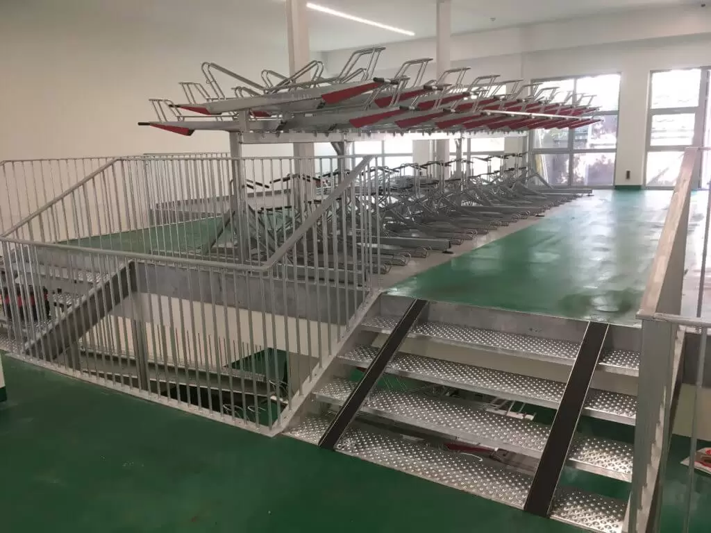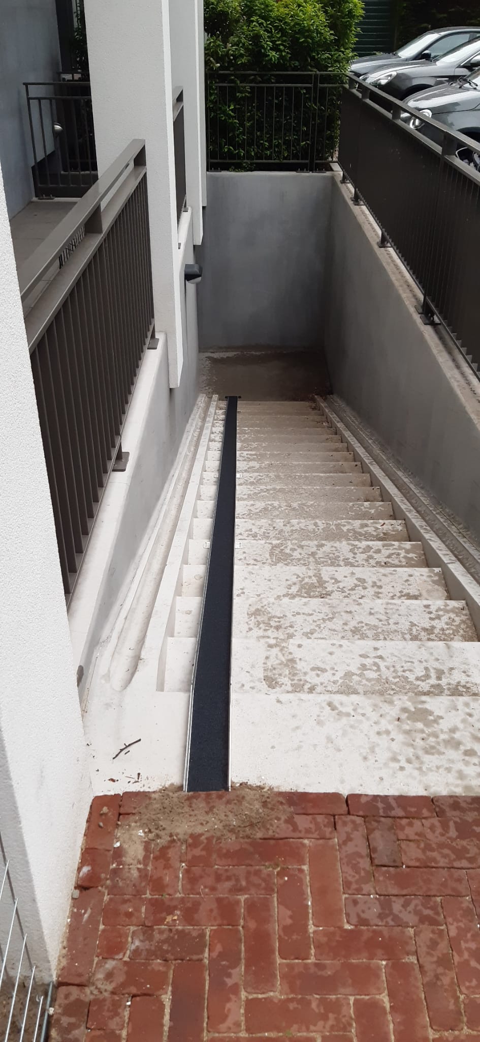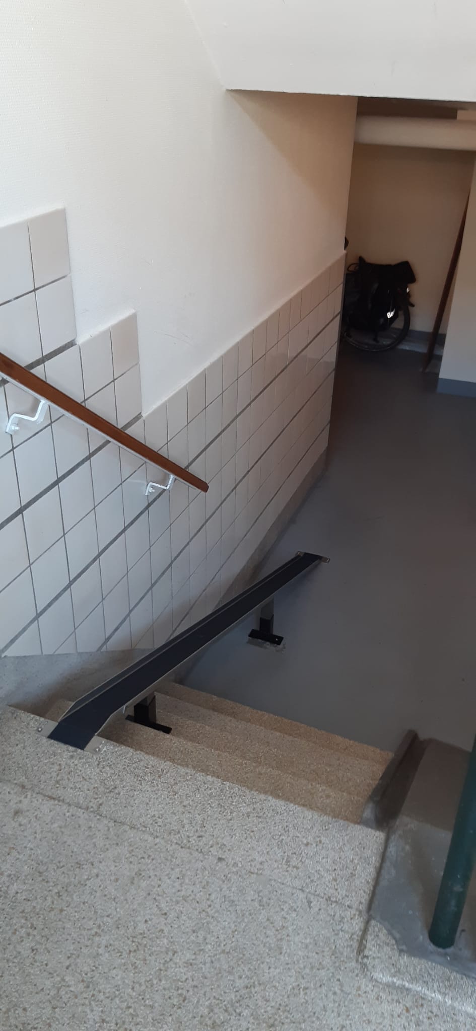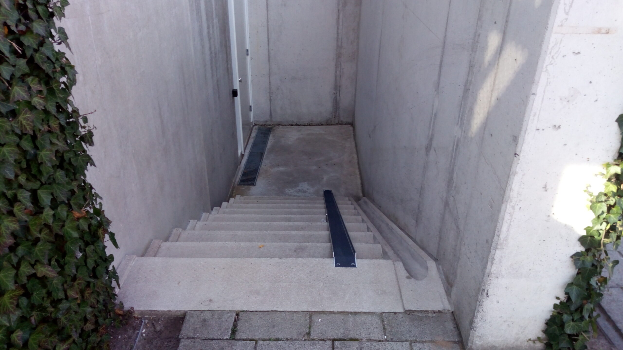 Im eingeklappten Zustand bleibt die Treppe vollständig und ohne Einschränkungen nutzbar. Wird eine Fahrradführung benötigt, kann die Schiene einfach ausgeklappt werden und nach Gebrauch wieder eingeklappt werden, wodurch die Treppe sofort wieder für den Alltagsverkehr zur Verfügung steht.